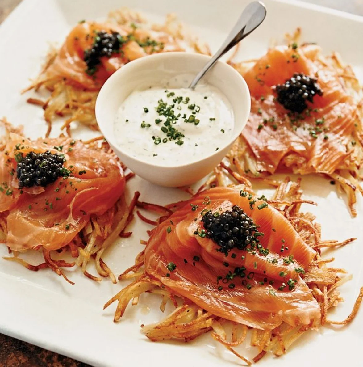 A bundle of smoked salmon (1/2 lb), caviar (1oz Siberian Sturgeon or 4oz Salmon, or both!) and house-made crème fraîche—perfect to round out savory Hanukkah spreads. Thanks to Maura McEvoy for Food&Wine for the photo.